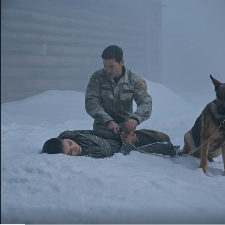 As he drew closer, the beam of his flashlight revealed the impossible. It was not one shape. It was two. The first was a woman. She lay on her side, her face pale as the snow it rested in. Dark hair was matted with ice against her forehead. She was wearing the remains of what looked like a police officer’s tactical pants and jacket, torn and stained with something dark that was freezing into the ground beneath her. Her hands were bound tightly behind her back with thick rope.